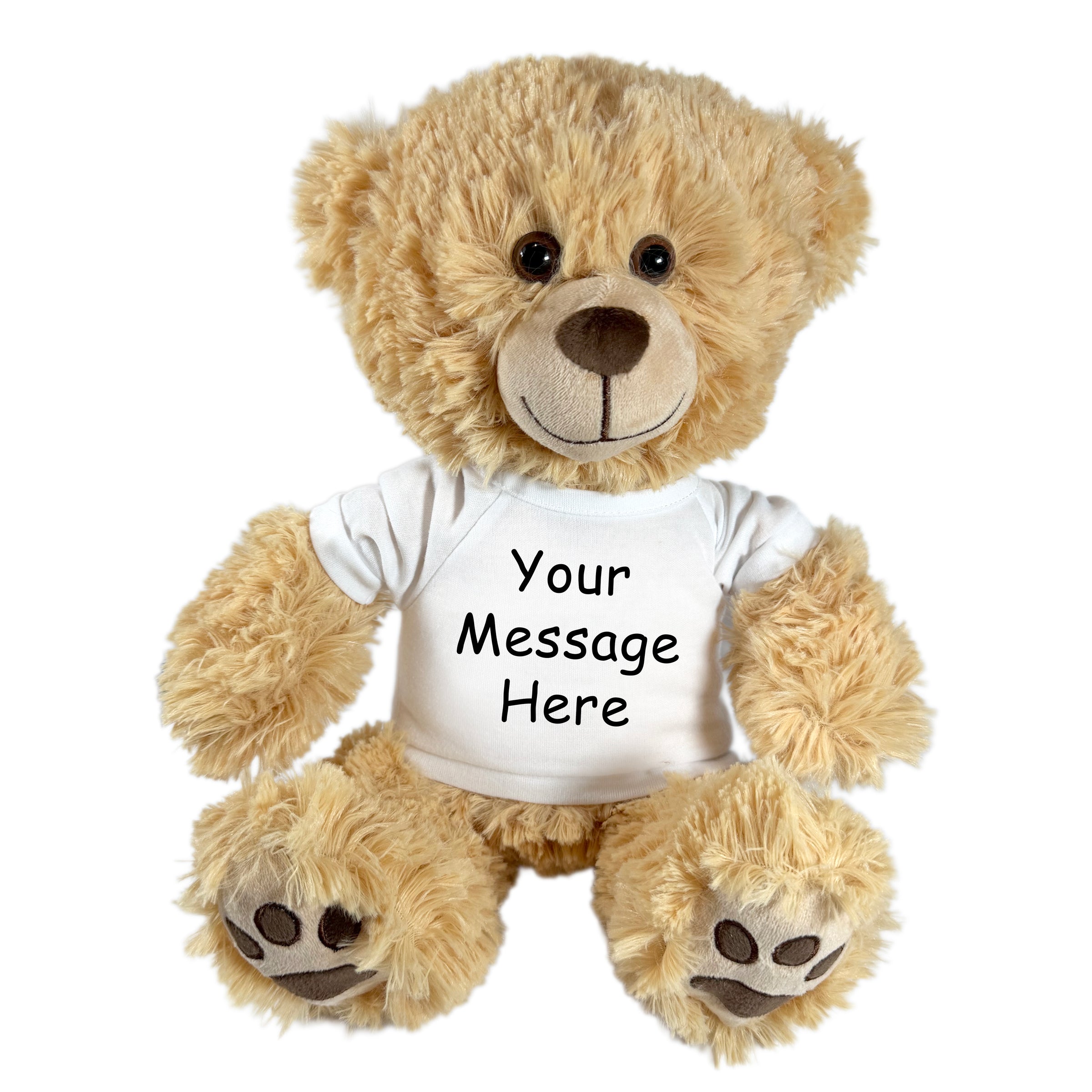 Looking for a cute, quality, but affordable personalized teddy bear? Honey Bear is one of our most popular teddy bears for all those reasons! This 14" honey colored bear has a plump tummy perfect for cuddling and large paws that give her lots of personality! Your teddy bear will arrive wearing a T shirt personalized with your message and graphic, photo, or logo. Personalization on the front side of your teddy bear’s T shirt is free. Add printing on the back or upgrade to a shirt with colored sleeves for a small additional fee. You can upload your photo on the order form above, or Choose from our selection of graphics, then return to this page to order your personalized teddy bear.